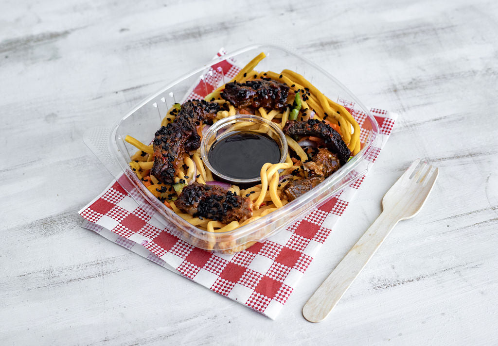 Hokkien noodles, marinated beef strips, capsicum, carrot, shallots, sesame seeds