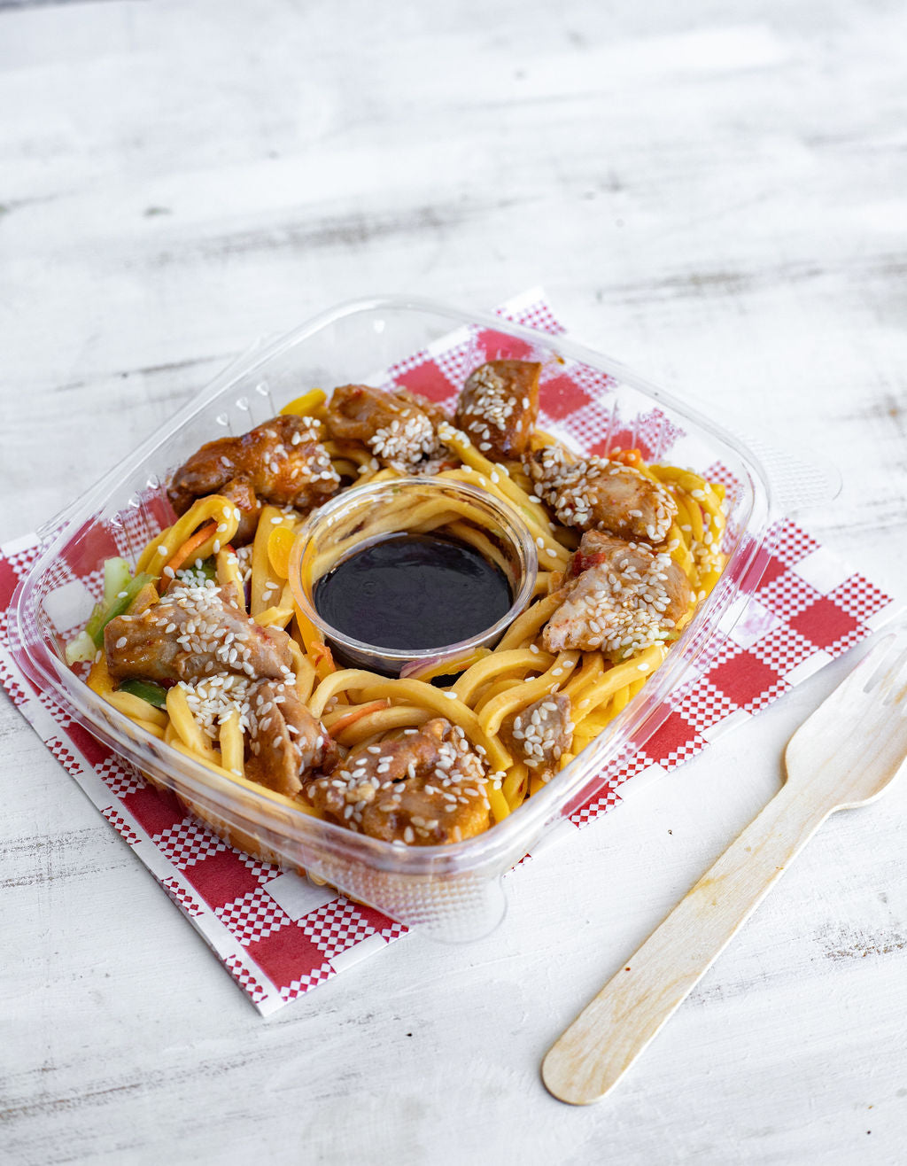 Hokkien noodles, marinated chicken strips, capsicum, carrot, shallots, sesame seeds