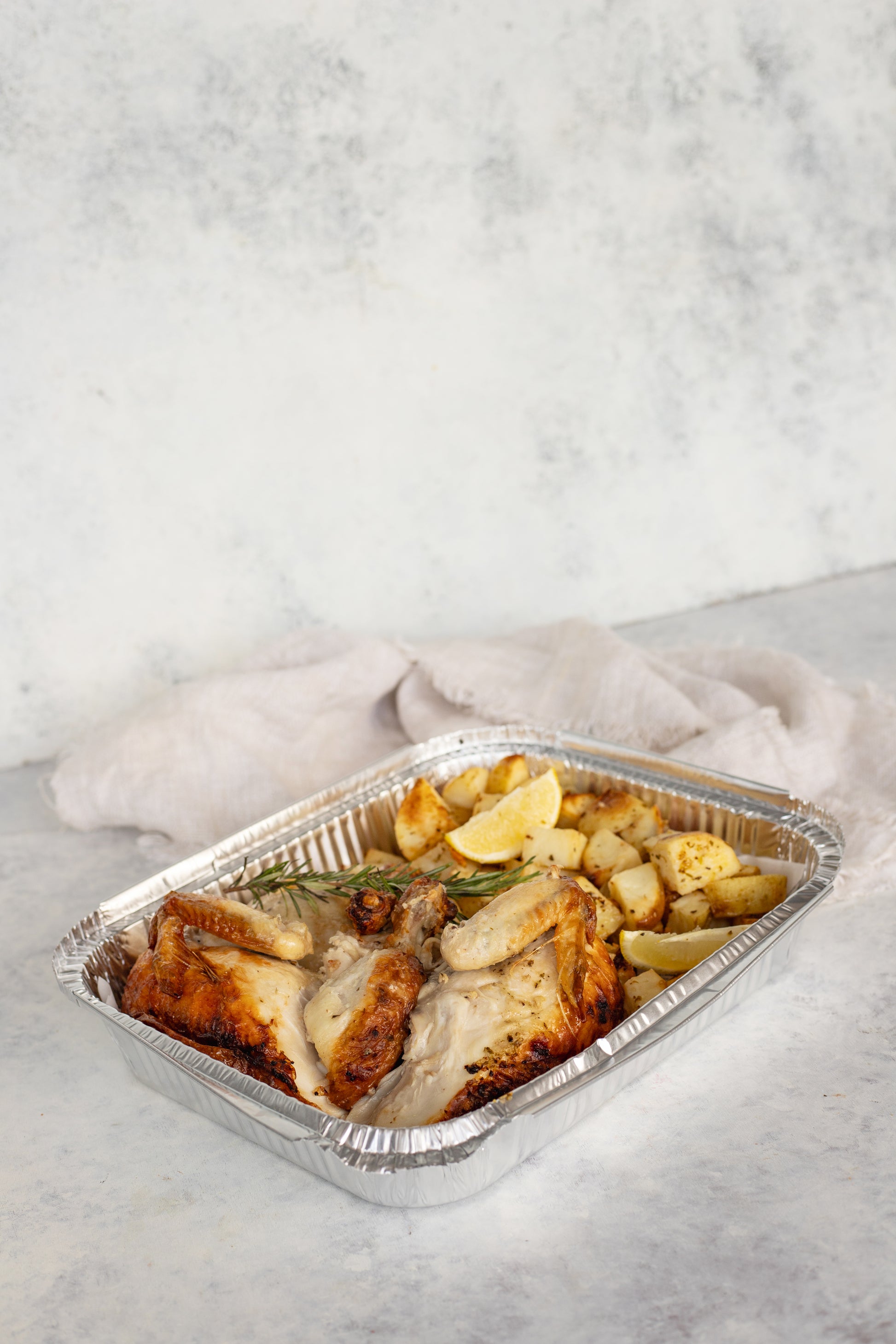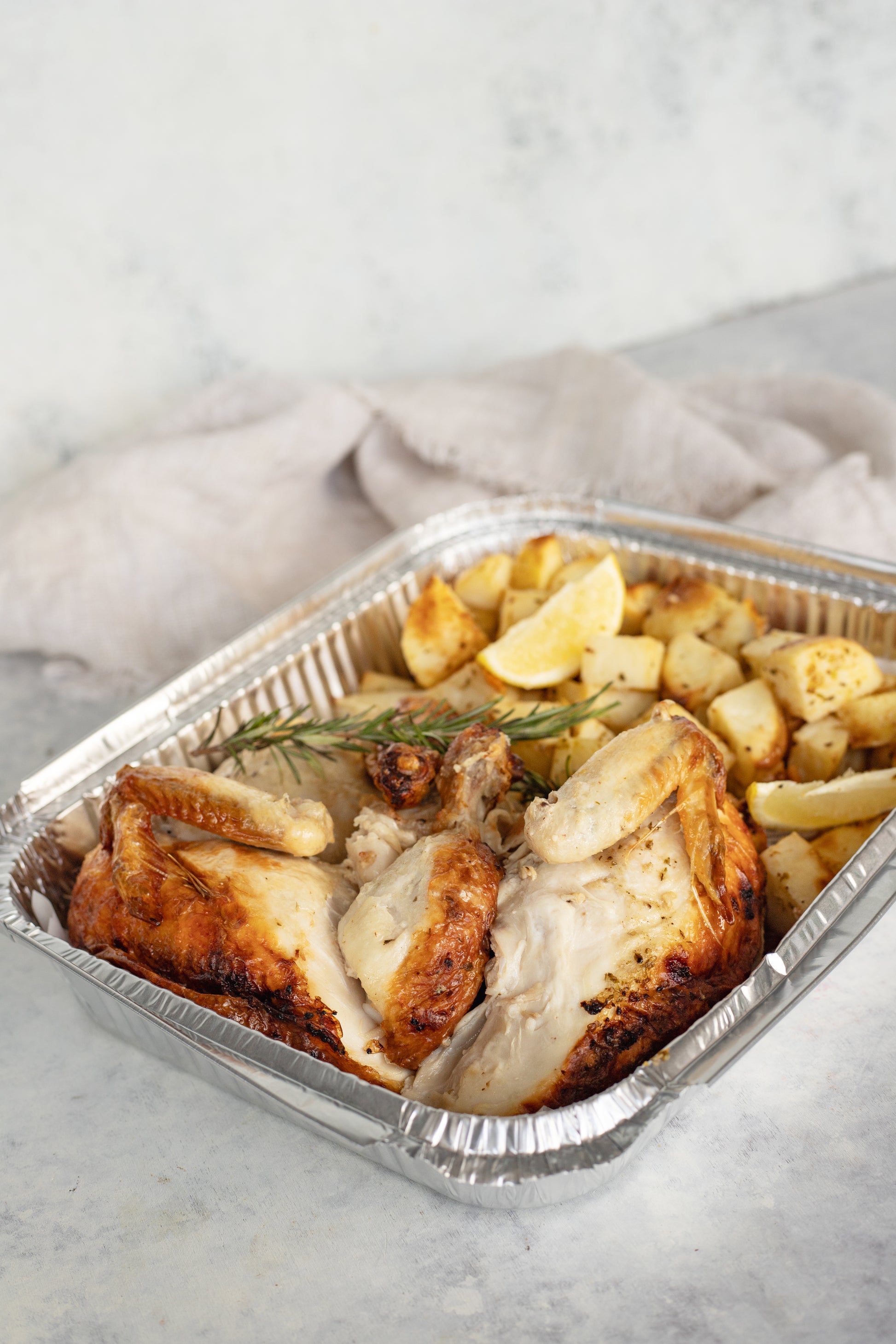 Whole roast Chicken, potatoes, lemon juice, oil, garlic, herbs & spices, salt & pepper.